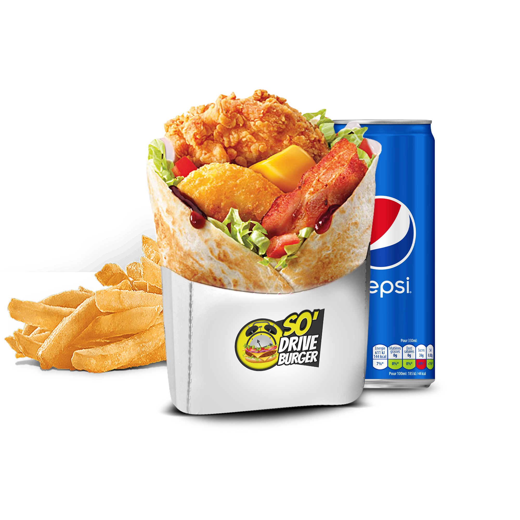 Pain Wrap 🥙, Sauce barbecue-mayo, Filet de poulet 🍗, Fromage 🧀, Galette pomme de terre 🥔, Bacon 🥓, Tomates 🍅, Salade 🥬