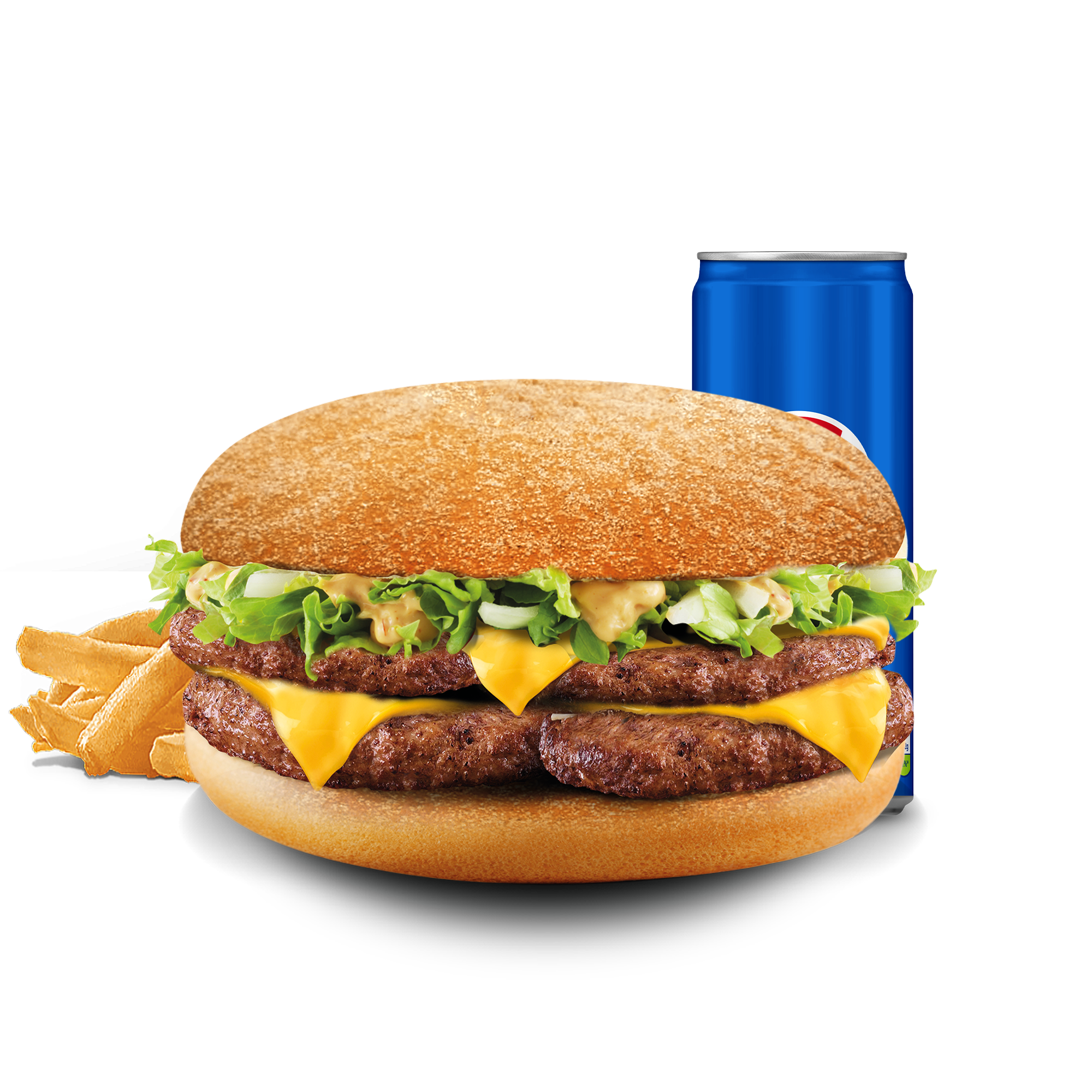 Pain Mega Bun 🥯, 🥩🥩 4 steaks 90g 🥩🥩, 🧀🧀 4 fromages 🧀🧀, Sauce giant, Oignons 🧅, Salade 🥬, Cornichons.
