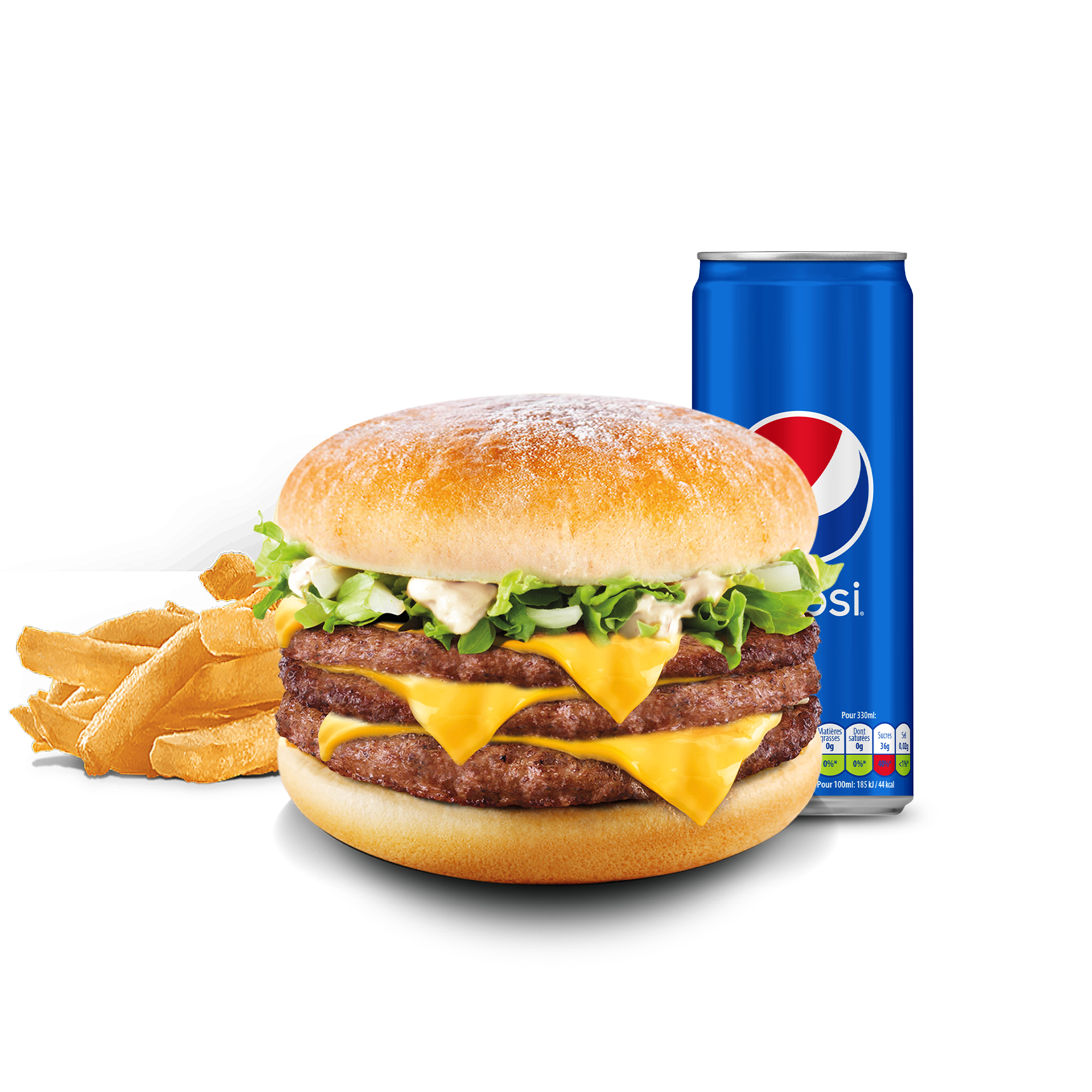 Pain Gourmet 🥯, Sauce fromagère 🧀, Triple steaks 45g 🥩🥩🥩, Triple fromages 🧀🧀🧀, Oignons 🧅, Salade 🥬