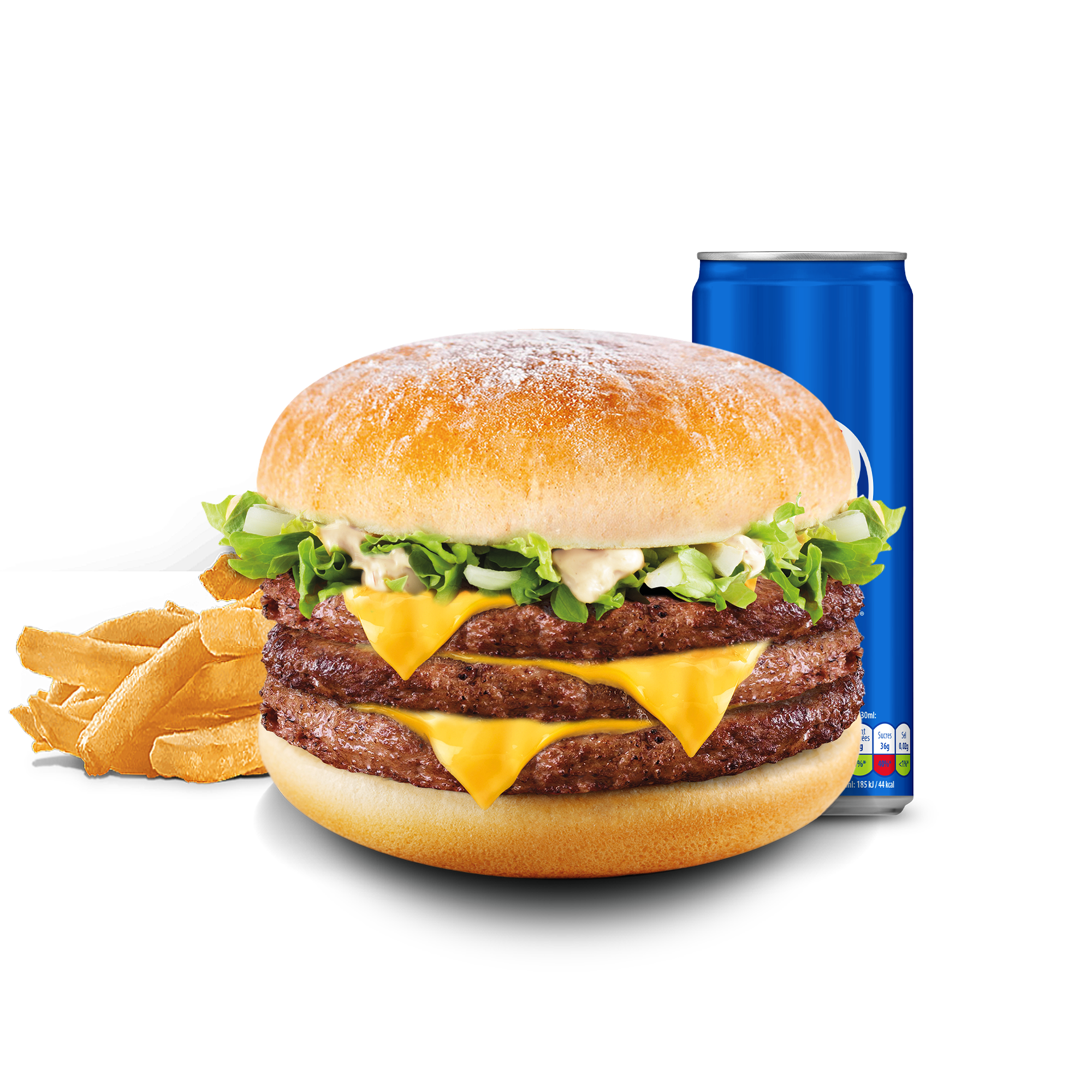 Pain Gourmet 🥯, Sauce fromagère 🧀, Triple steaks 90g 🥩🥩🥩, Triple fromages 🧀🧀🧀, Oignons 🧅, Salade 🥬
