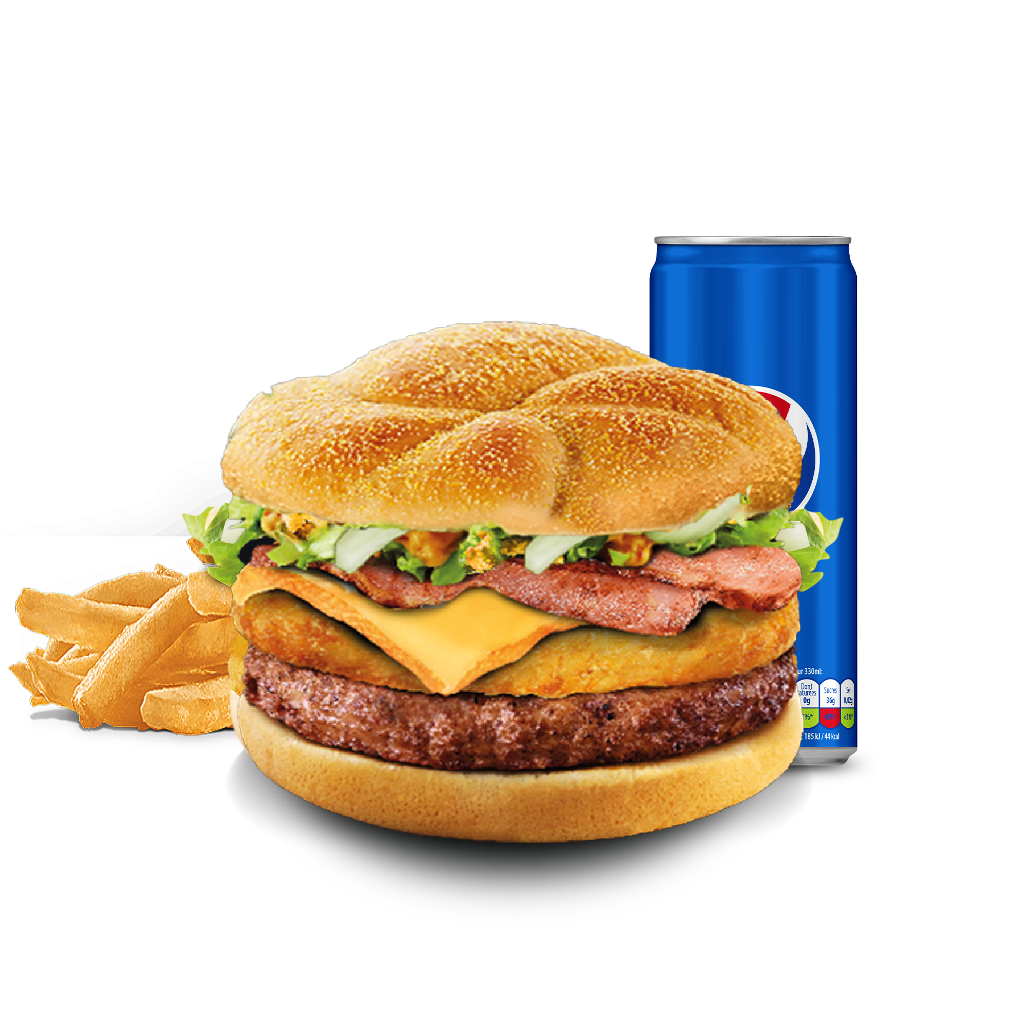 Pain King 🥯,Steak, Sauce Fumée 🧂, Double fromages 🧀🧀, Bacon 🥓, Galette pomme de terre 🥔,oignons🧅, Salade 🥬