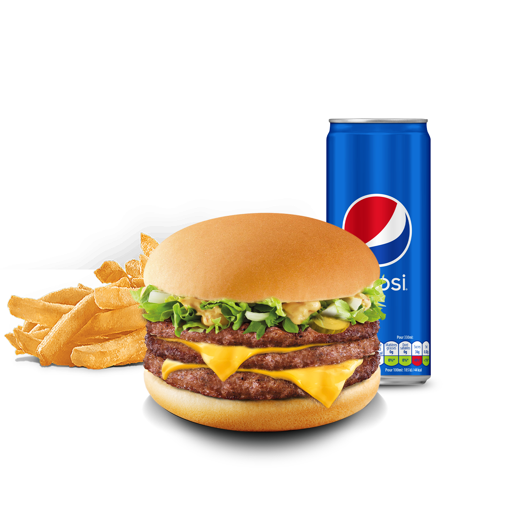 Pain Double-cut 🥯,Double steaks 45G🥩🥩, Sauce Ronald 🤡, Fromage 🧀, Oignons 🧅, Salade 🥬, Cornichons