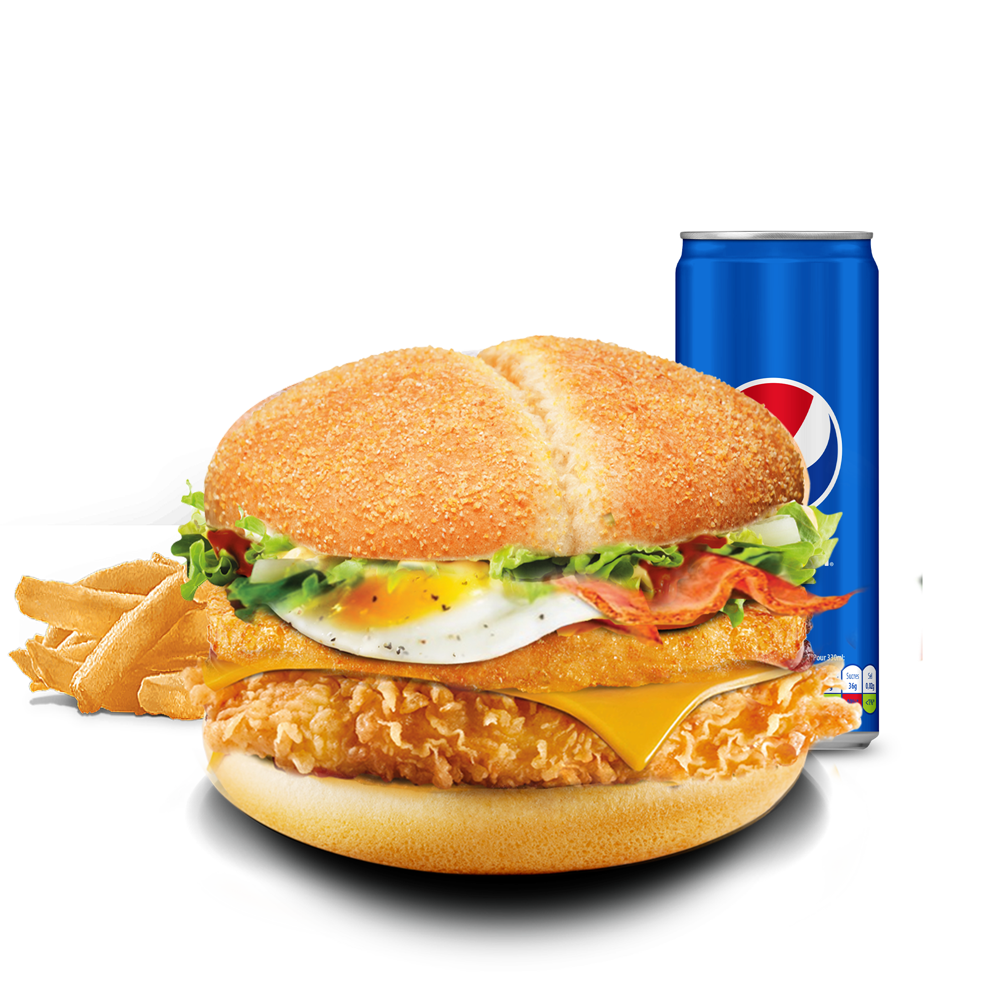 Pain King 🥯,Filet de poulet 🍗, Sauce mayo-bbq 🧂, Double fromages 🧀🧀, Bacon 🥓, Oeuf 🍳, Galette pomme de terre 🥔, Tomates 🍅, Salade 🥬